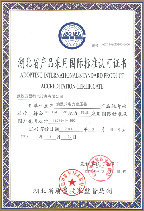 湖北省產(chǎn)品采用國際標準認可證書(油變)