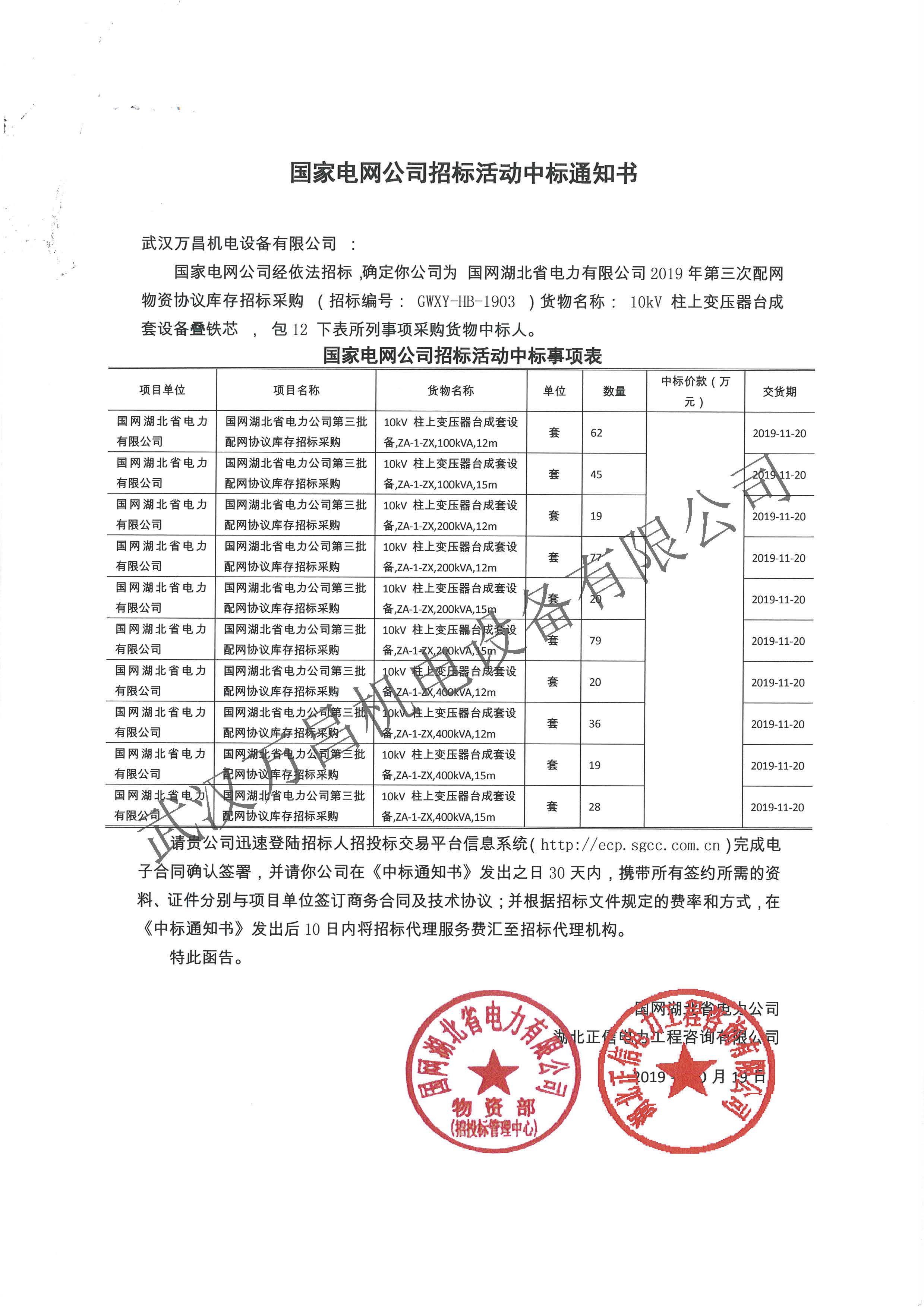 2019年中標(biāo)國網(wǎng)湖北省協(xié)議庫存項目